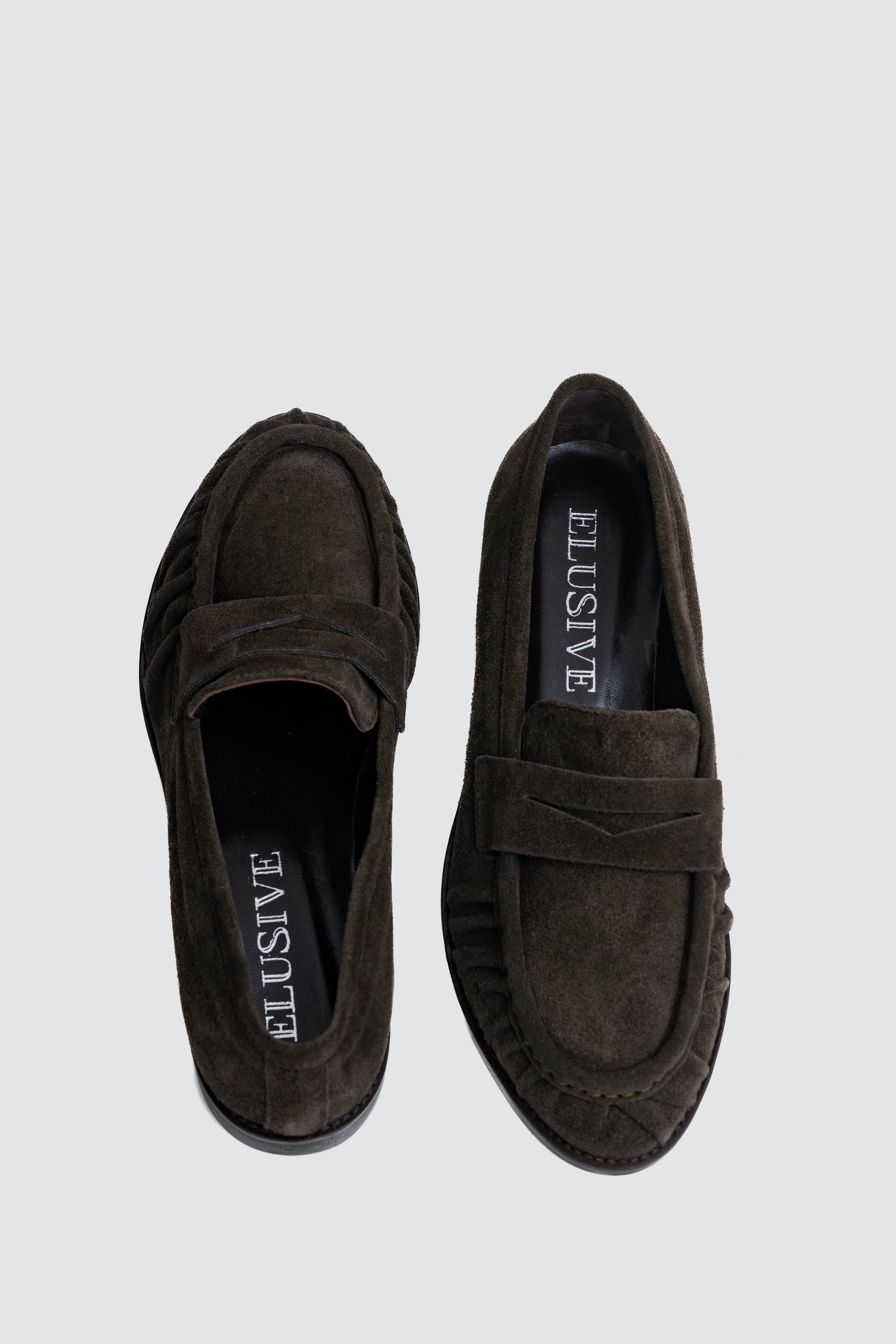 Costruzione: cucitura moc con arricciatura frontale, fascia penny sul collo piede