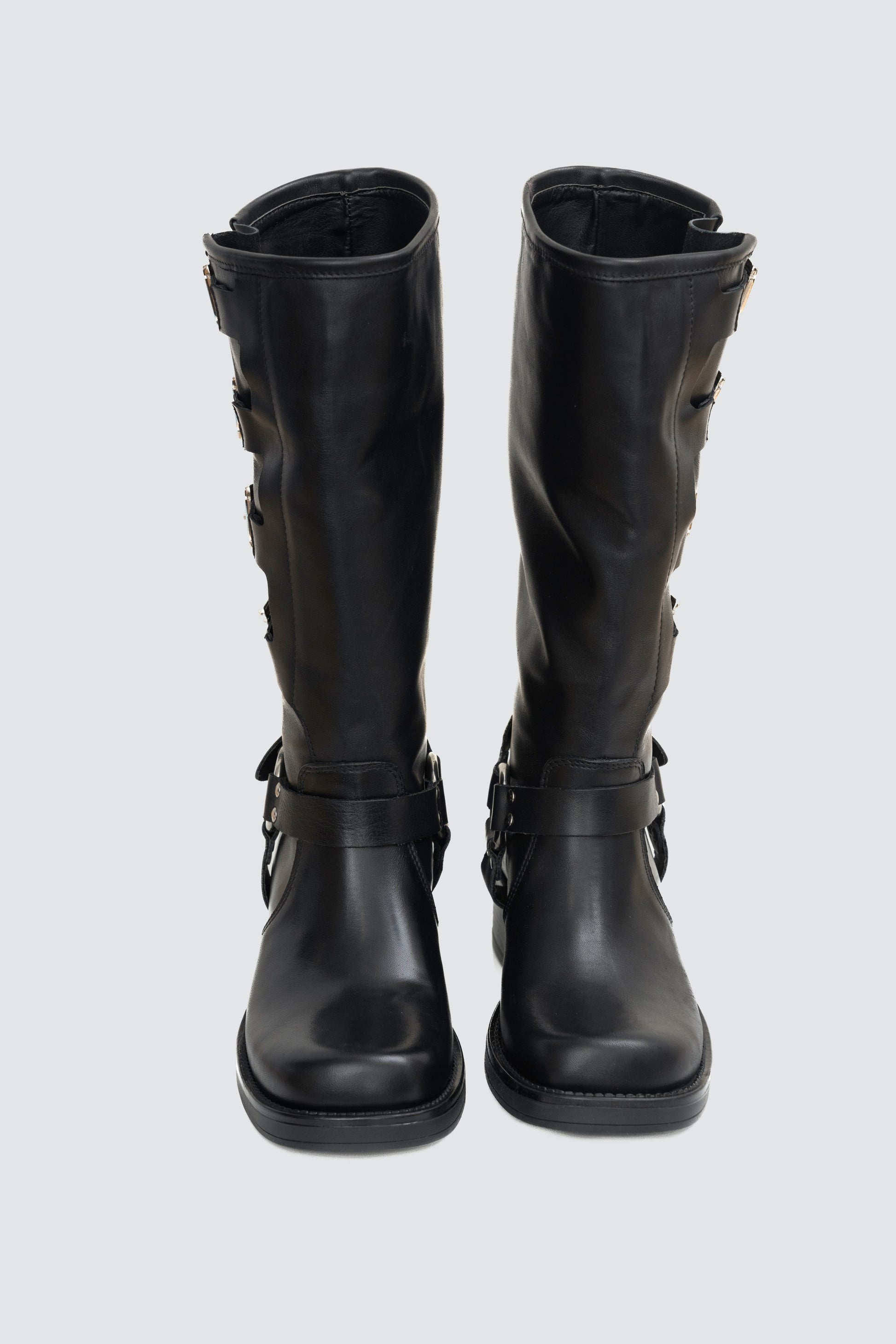Carattere grintoso e anima rock: questo stivale biker in pelle nera è arricchito da cinque fibbie regolabili e da un cinturino con anello metallico che richiama lo stile motociclista più autentico. La linea slanciata e la suola solida con tacco basso lo rendono un alleato di carattere per ogni look urbano, capace di trasformare anche l’outfit più semplice in una dichiarazione di stile.