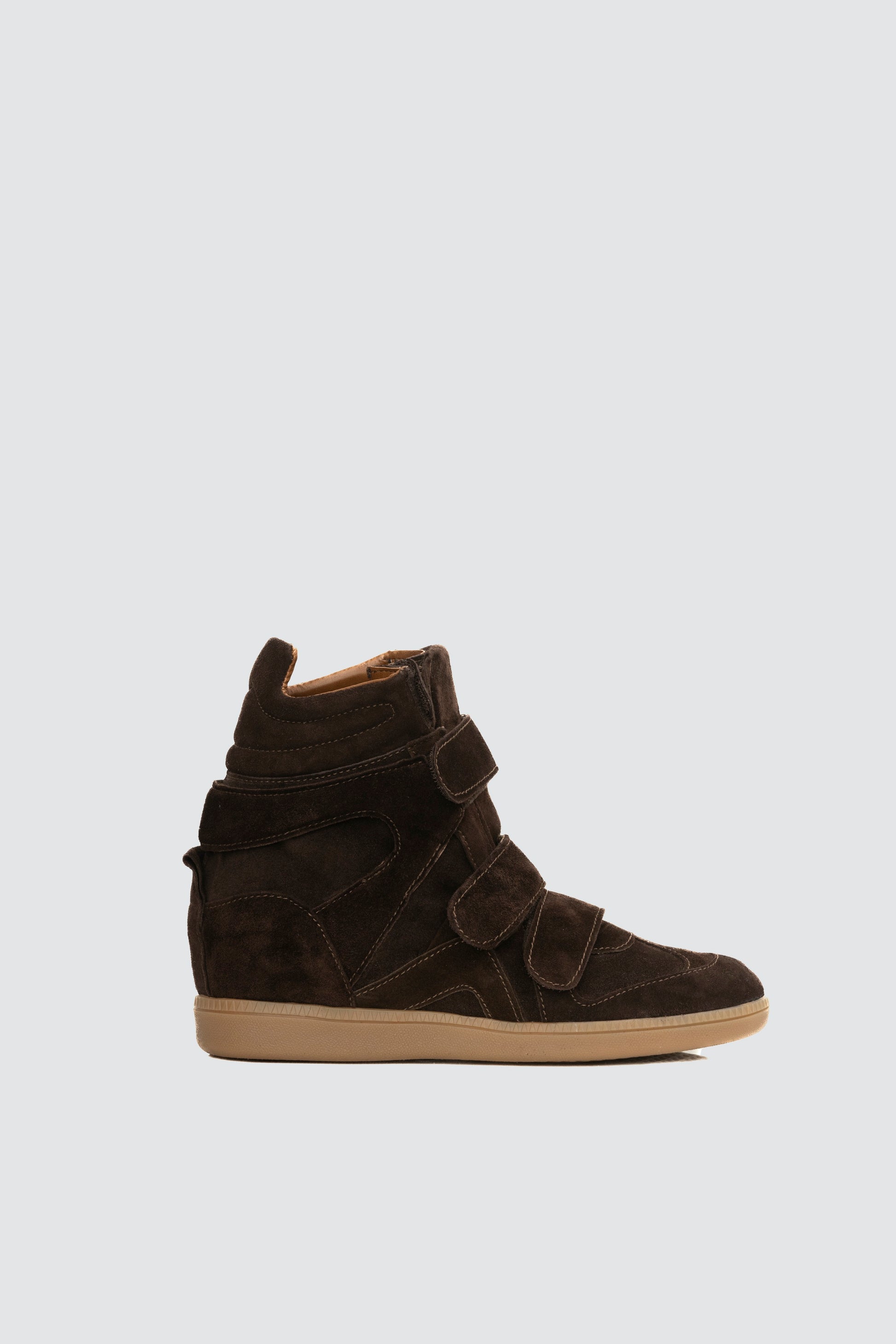 Sneaker dal design contemporaneo realizzata in morbida nappa liscia e inserti in camoscio tono su tono. La silhouette è arricchita da un tacco interno nascosto che slancia la figura senza rinunciare al comfort. La chiusura con pratici strappi a velcro assicura una calzata regolabile e dal mood sportivo-chic. Suola in gomma color miele per un tocco casual e versatile.