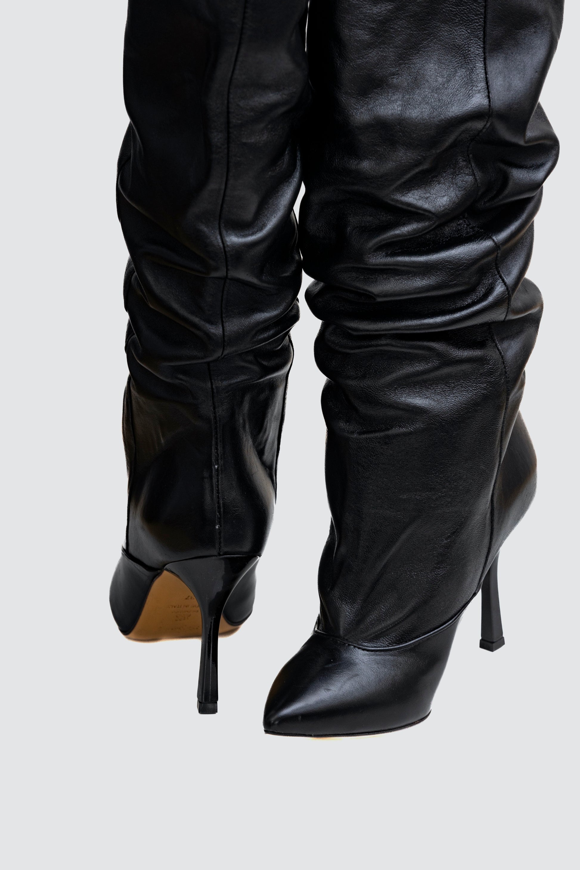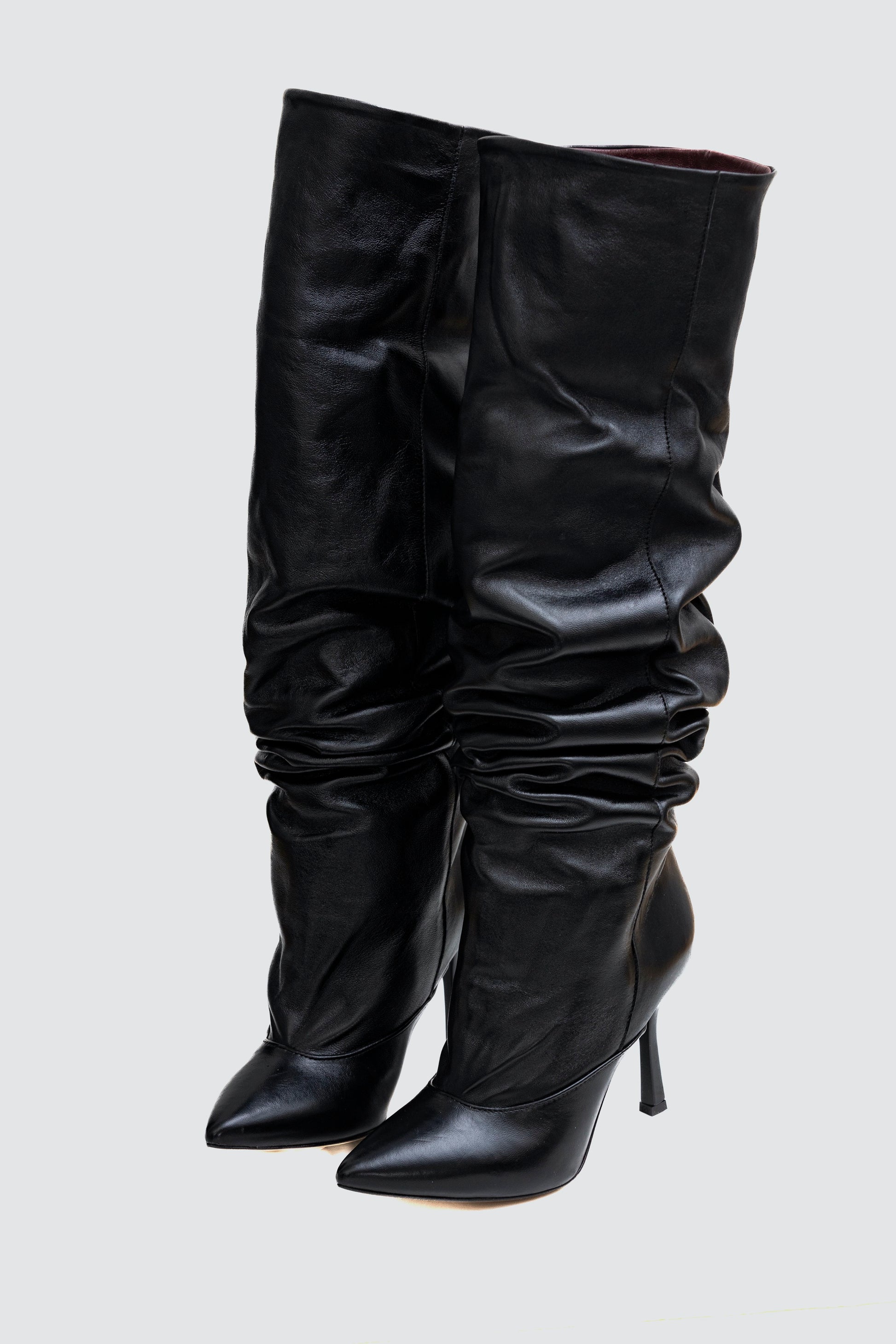 Realizzato in morbida pelle color NERO, avvolge la gamba con una linea sinuosa e pulita, priva di zip per un effetto essenziale e moderno.