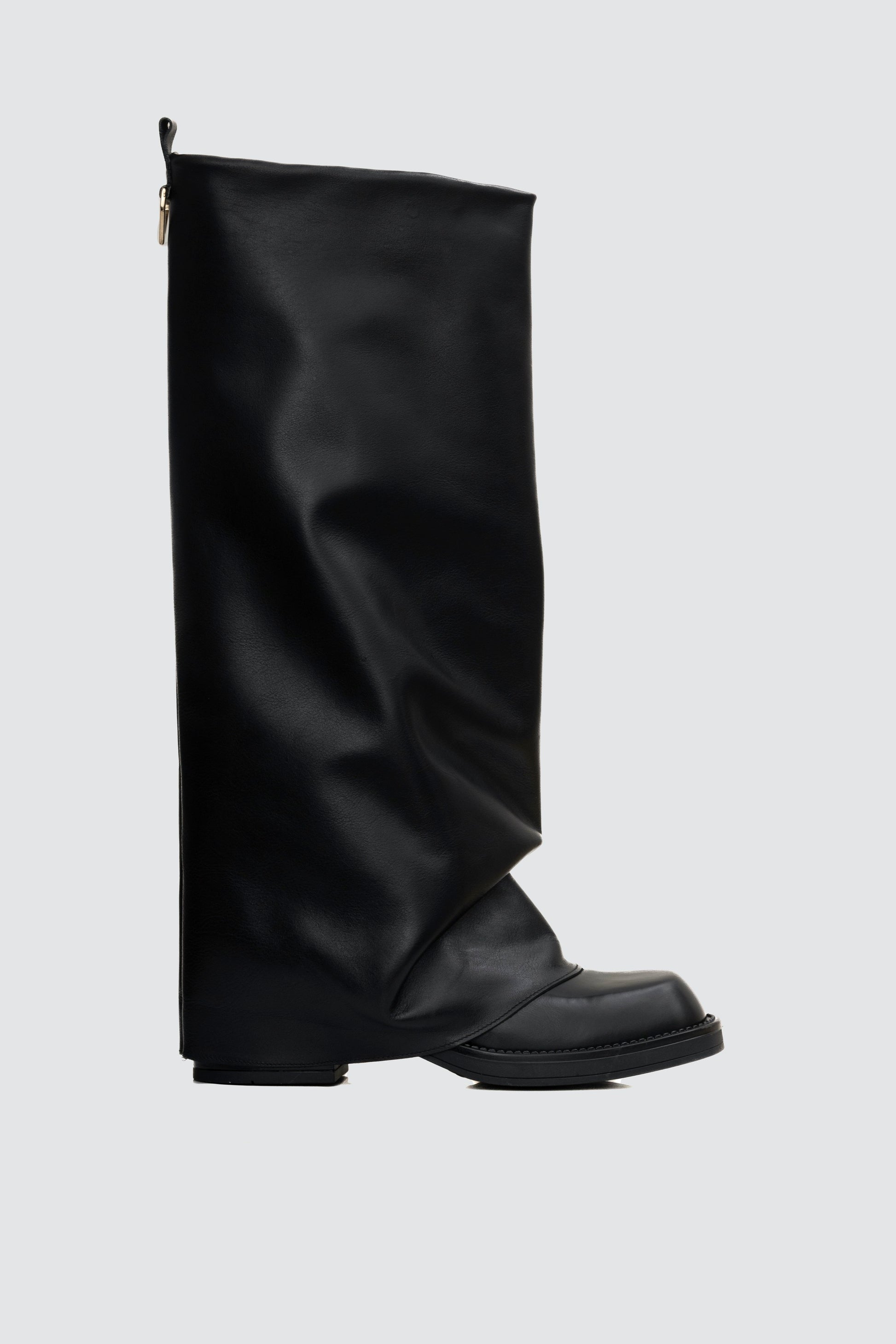 Un design audace e contemporaneo che ridefinisce il concetto di minimalismo. Realizzato in morbida pelle nera effetto buttero, questo stivale si distingue per la sua silhouette ampia e cadente, che avvolge la gamba con un effetto “slouchy” naturale e sofisticato.